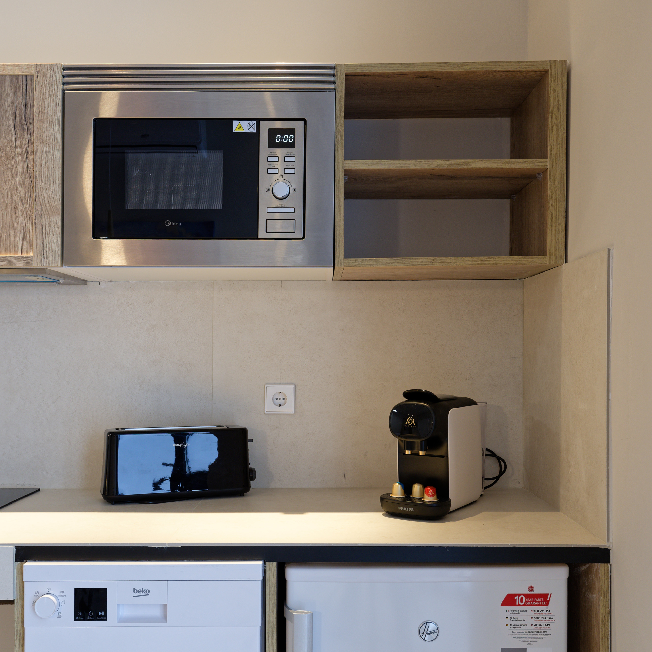Die Offene Küche mit Induktions-Kochfeld ist ausgestattet in einen Kühlschrank, eine Mikrowelle, Gefrierschrank, eine Spülmaschine, Geschirr/Besteck, Kochutensilien, eine Kaffeemaschine, einen Toaster und einen Wasserkocher.
