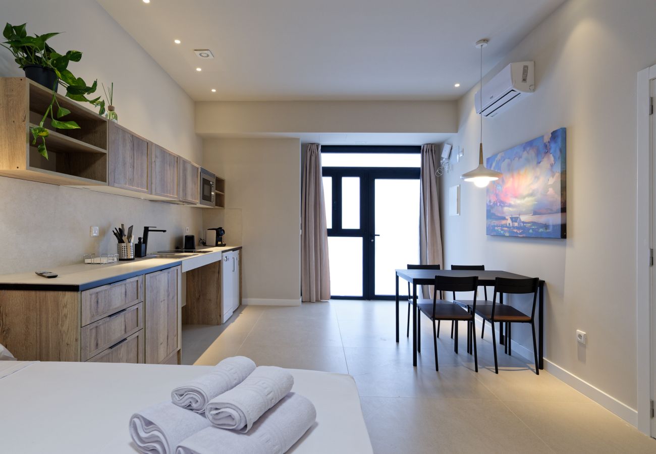 The studio features an open plan design that maximizes every square meter, offering a spacious and bright environment. The neutral tones and high-quality materials used in the decoration create an elegant and welcoming space. The fully equipped open-plan kitchen blends harmoniously with the living room, providing a perfect space for cooking and relaxing.